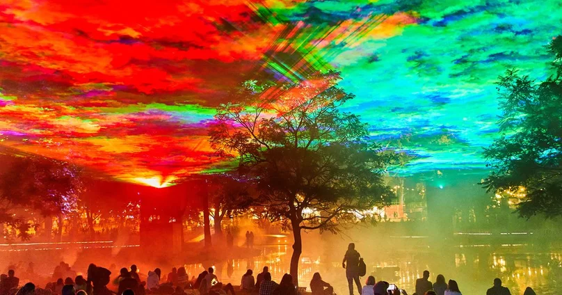 一連三個星期,每晚經過藝術公園草坪,抬頭便會發現遠方的北極光,隨著《約定極光》驟然直送香港;附近的旱溪出現動人的《夜光森林》,讓你跟親友一同在霧中散步賞花。探訪戲曲中心,正展出《智能閃閃》,數百個機械人獻上燈光表演。