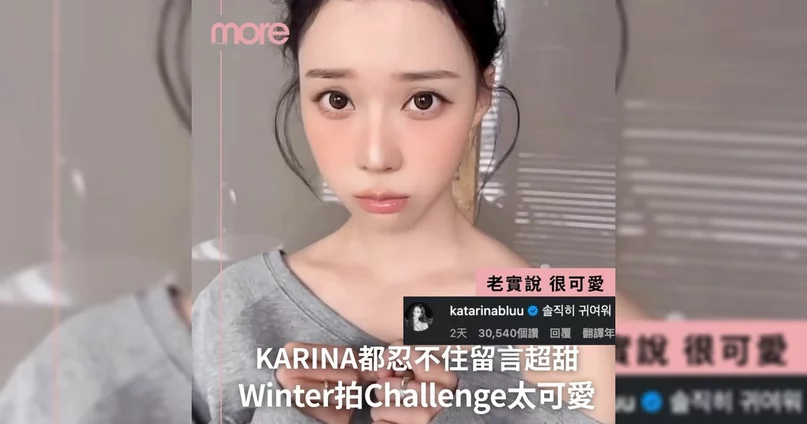 aespa官方近日推出了全新的Challenge影片,Winter的個人挑戰展現出超級可愛的一面,連Karina都忍不住留言互動大讚Winter真的超可愛,不少粉絲也覺得Karina與Winter超甜的!