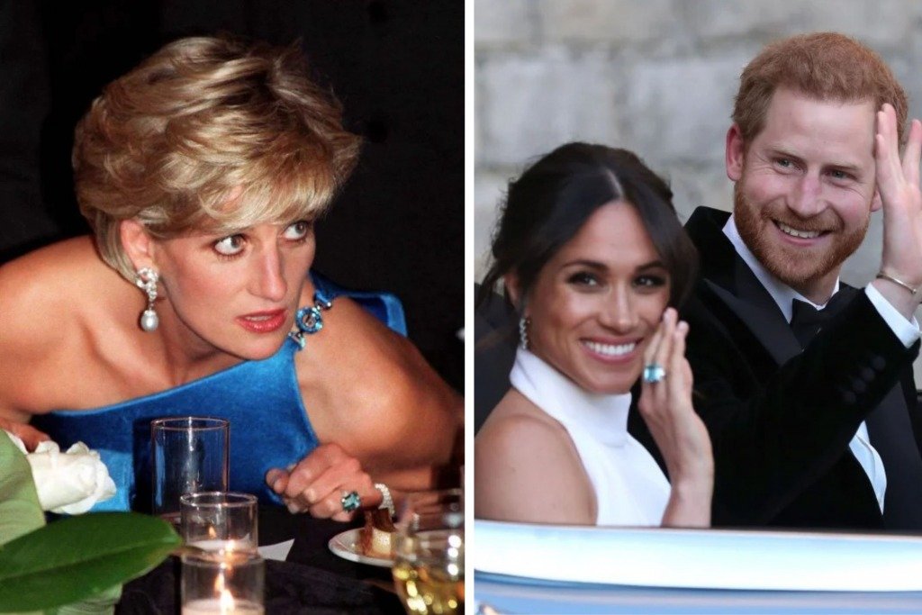 這隻戒指的主石為一顆祖母綠切工的方形海藍寶石,晶瑩剔透,很有分量,配上一襲藍色緞面長裙,成為宴會上的一道風景線。很多年後,梅根在自己的婚宴中也戴上了這枚戒指,貴氣十足。