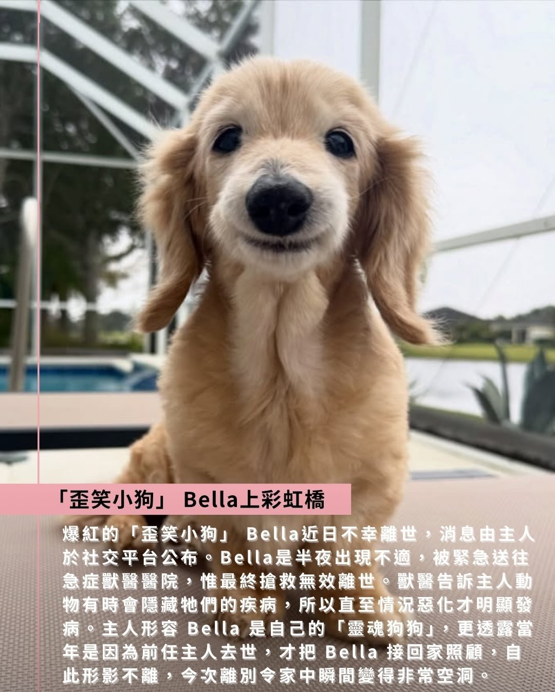爆紅的「歪笑小狗」 Bella近日不幸離世,消息由主人於社交平台公布。Bella是半夜出現不適,被緊急送往急症獸醫醫院,惟最終搶救無效離世。獸醫告訴主人動物有時會隱藏牠們的疾病,所以直至情況惡化才明顯發病。主人形容 Bella 是自己的「靈魂狗狗」,更透露當年是因為前任主人去世,才把 Bella 接回家照顧,自此形影不離,今次離別令家中瞬間變得非常空洞。