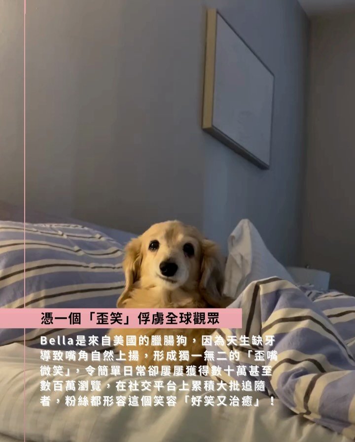 Bella是來自美國的臘腸狗,因為天生缺牙導致嘴角自然上揚,形成獨一無二的「歪嘴微笑」,令簡單日常卻屢屢獲得數十萬甚至數百萬瀏覽,在社交平台上累積大批追隨者,粉絲都形容這個笑容「好笑又治癒」!如今傳出噩耗,不少網民留言表示「好像失去了一位老朋友」。