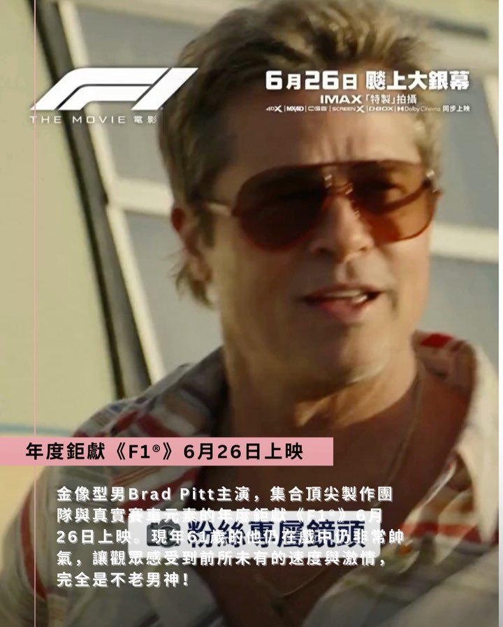《F1》由破盡紀錄的《壯志凌雲:獨行俠》約瑟高辛斯基執導,金像巨星畢彼特(Brad Pitt)領銜主演,並由七屆一級方程式賽車(F1)世界冠軍Lewis Hamilton擔任監製,即將於2025年6月26日強勢登陸全港戲院!這部集合頂尖製作團隊與真實賽車元素的年度鉅獻,將F1賽車的極速激情與人性故事完美融合,勢必掀起全城熱潮!