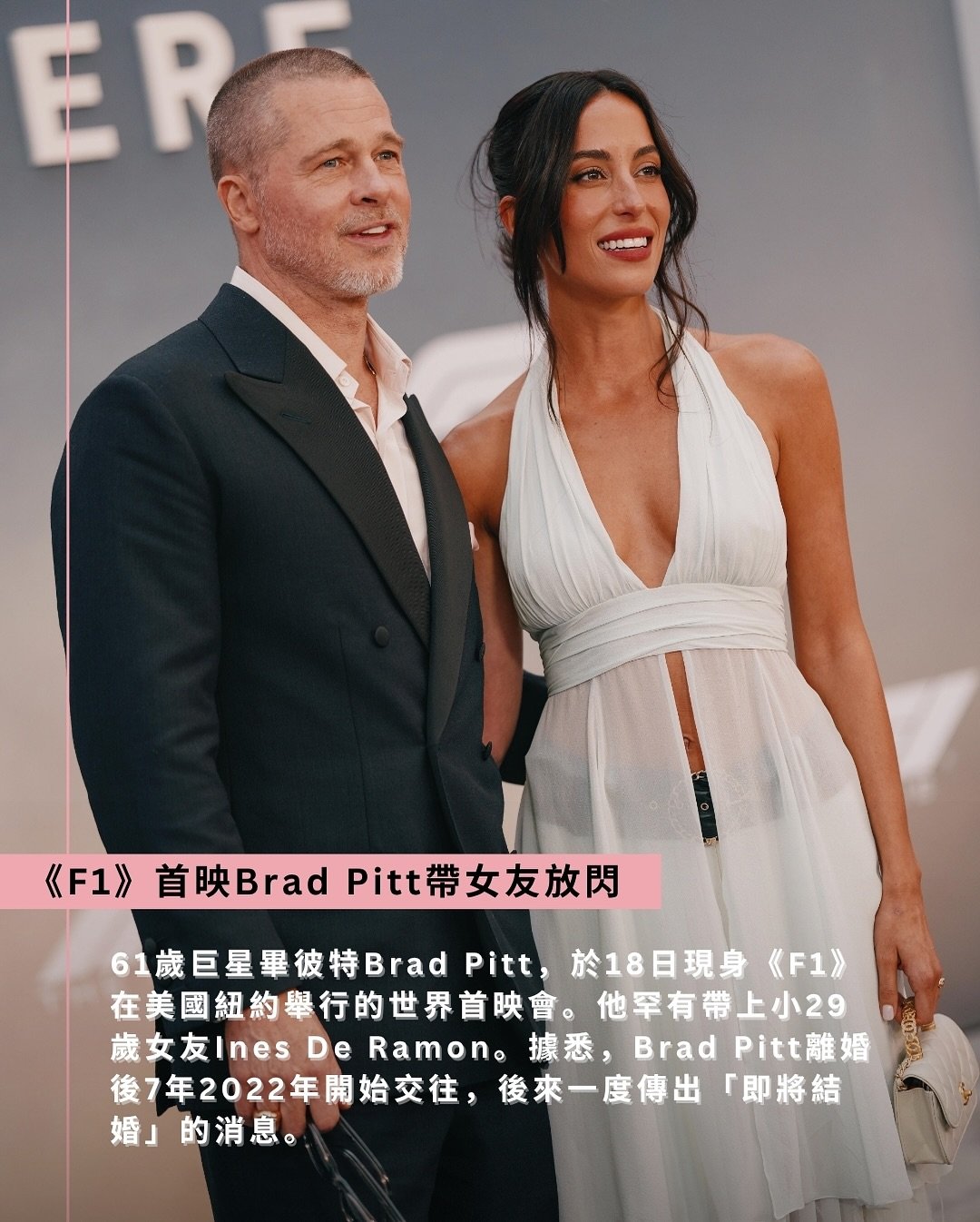 61歲巨星畢彼特Brad Pitt,於18日現身《F1》在美國紐約舉行的世界首映會。他罕有帶上小29歲女友Ines De Ramon。據悉,Brad Pitt離婚後7年2022年開始交往,後來一度傳出「即將結婚」的消息。這位男神原來曾經歷2段婚姻,不知道這位小女友會否是最後一個?