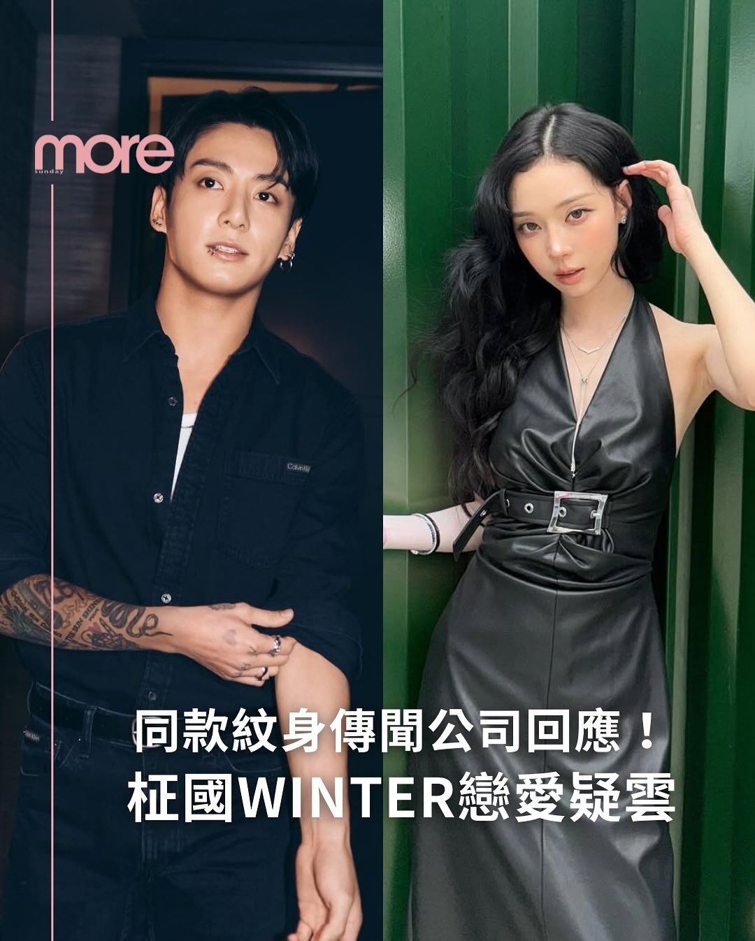 BTS成員柾國Jungkook與aespa成員Winter近日捲入戀愛傳聞,源於韓國網上論壇流傳的「證據」。網民指出兩人擁有相似刺青,包括三隻小狗圖案的位置相近,雖然照片疑似經過後製處理,卻引發廣泛猜測,迅速成為韓娛圈熱話。柾國公司及SM Entertainment均對傳聞採取中立態度,表示「沒有立場可說。」