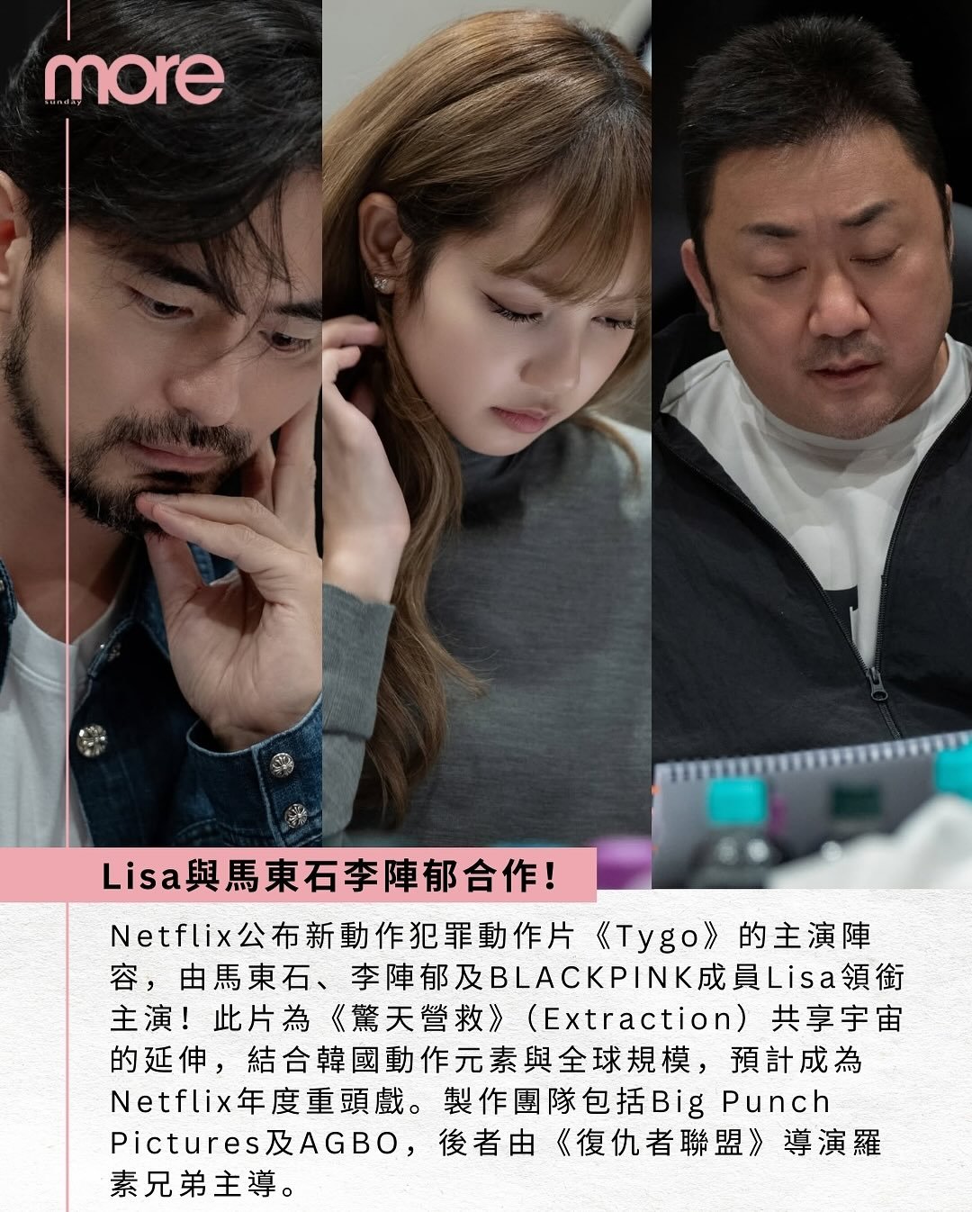 Netflix公布新動作犯罪動作片《Tygo》的主演陣容,由馬東石、李陣郁及BLACKPINK成員Lisa領銜主演!此片為《驚天營救》(Extraction)共享宇宙的延伸,結合韓國動作元素與全球規模,預計成為Netflix年度重頭戲。製作團隊包括Big Punch Pictures及AGBO,後者由《復仇者聯盟》導演羅素兄弟主導。