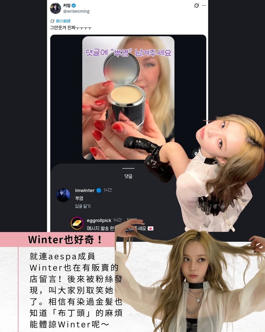 就連aespa成員Winter也在有販賣的店留言!後來被粉絲發現,叫大家別取笑她了。相信有染過金髮也知道「布丁頭」的麻煩能體諒Winter呢~