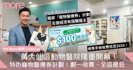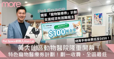 提及Pet Space全新成立的黃大仙區動物醫院有哪些特色服務,Alan表示將以「寵物社區醫院」的理念為核心,致力為社區內的毛孩提供親民且高質素的醫療服務。黃大仙區動物醫院將寵物醫療費用定位為全區最低,讓更多寵主能夠輕鬆負擔寵物的健康護理,真正實現醫療平民化。此外,黃大仙區動物醫院同時是Pet Space「寵物醫療券」計劃的先行診所,計劃專門支援經濟有困難的寵主,符合資格者每年最高可獲得2,000港元的寵物醫療津貼,可一次使用,或分數次使用,即時減輕醫療負擔。