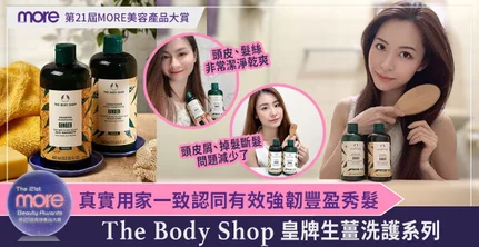 The Body Shop升級版皇牌生薑頭皮洗護系列一向深受用家歡迎,能一步解決多個頭髮、頭皮問題,創下每8秒賣出一支的佳績之餘,更剛榮獲由讀者投票More第21屆MORE美容產品大賞「最喜愛的頭髮護理產品」,受歡迎程度無容置疑!