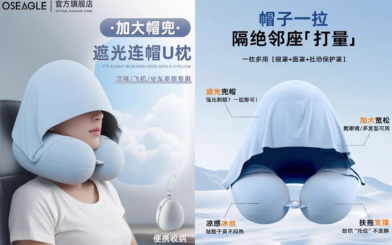 設計細緻,加大帽兜,遮光連帽U枕,適合經常坐長途車或出差坐長途機的朋友。一枕多用,可作眼罩、面罩和社恐保護罩,一拉即遮刺眼強光!採用涼感冰絲素材,貼面乾爽不悶熱,設扶拖支撐,有助承托不歪脖。符合人體工學專業護頸設計,360度貼合環繞感,怎麼睡都舒服!