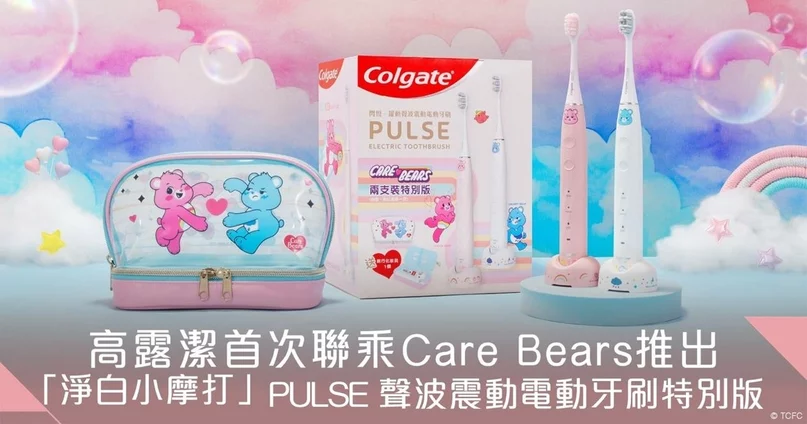 美編私心分享 – 高露潔聯乘Care Bears,驚喜推出限量版「淨白小摩打」Pulse聲波震動電動牙刷,讓你的每一個微笑都閃耀動人!可愛Care Bears化身美白牙齒小幫手,不僅外觀可愛吸引眼球,更帶有3倍美白功效*及100倍潔淨力^。兩支裝特別版更附送可愛實用的Care Bears旅行化妝袋,無論是自用還是送禮,都是完美之選!