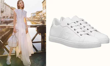 HERMÉS這款小白鞋看似沉實,但細緻度十足,鞋身繡有銀灰色的「H」標誌。