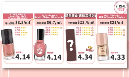 2021指甲油推薦有甚麼?最近不能找美甲師整gel 甲,就自己塗塗指甲油吧!大家挑選指甲油時,最重視甚麼呢?除了上色效果和持不持久外,原來不少人更關心甲油顏色是否夠顯白!以下便精選了數款iTRIAL會員給予好評的指甲油推薦給大家,更會從各方面表現比拼看看哪款指甲油最值得推介!