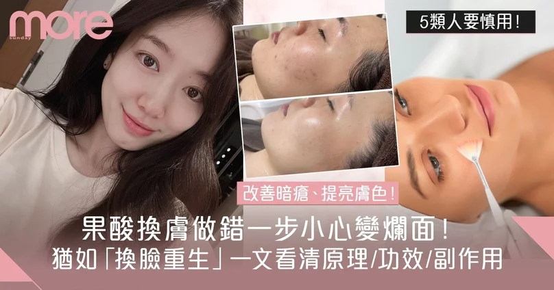 果酸換膚顧名思義,是將勞損不已又坑坑窪窪的舊肌膚淘汰,重生健康白淨的新皮膚,主要利用從水果中提煉出來的果酸化學酸性成分,滲透至皮膚真皮層,去除皮膚表面的老廢角質,並促進皮膚加速更新。常見果酸包括杏仁酸、乳酸、甘醇酸等,它們可在皮膚表面引起輕微的剝落和再生,同時於真皮層刺激膠原蛋白增生,從而改善膚質、暗瘡、粉刺、暗瘡印、色素沉澱等問題。