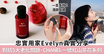 CHANEL一號紅山茶花精華液為護膚中最重要的一分,配方蘊含95%天然成分,當中包括76%山茶花成分萃取,花瓣、種子與酵母的高濃度養分均包含在內,每滴精華都擁有最高效的抗衰老功能。凝露質感極輕薄易推,水感質地一抹即可被肌膚吸收,持續早晚使用,短時間即發現皺紋明顯減淡,毛孔變得細緻,肌膚重拾彈性,肌膚舒適輕爽,重現活力光采。經試用連續使用一個月,發現皺紋減淡24 %1、光澤度與彈性均提升17%1,毛色顯眼度也減少了11%2,舒適感更大大提高43%3,屬混合敏感性肌膚的Evelyn,也大讚用後看著肌膚一日比一日健康,敏感情況日復日改善,修復功效絕對有目共睹!