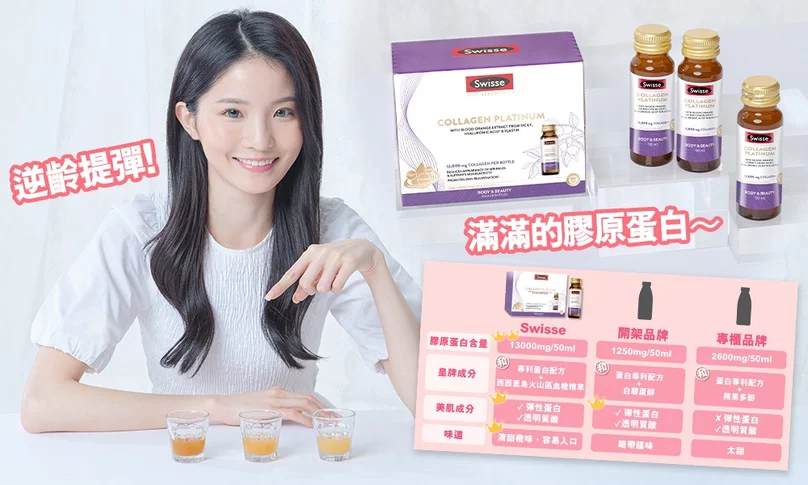 要挑選好的膠原蛋白飲,當然就要看每一支當中的膠原蛋白含量,就這方面比較,屬於其中一款開架品牌的Swisse鉑金膠原蛋白美肌飲每支蘊含13,000mg的膠原蛋白,是市面上少數擁有高濃度膠原蛋白,而且是歐洲德國專利VERISOL®臨床實證膠原蛋白,美肌成分達專業級;另外亦加入彈性蛋白及透明質酸,重點為肌膚補充水分,三重鎖水提彈,除了有助抗氧化,還幫助減淡細紋,逆轉肌齡。
