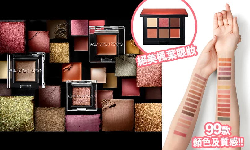色彩百搭易襯的眼影組合,最適合「手殘女」零難道打造層次感眼妝!小編推薦ADDICTION睛藝99+限定眼影盤,一盒即可享受5種質感的眼影,#01 Delicate Beams齊集金米色、紅寶石紅粉色、焦土棕色、柔和橙磚色、生動的啞光駝色及潤澤的暗橙色,助你輕鬆化上今季大熱的楓葉眼妝。
