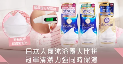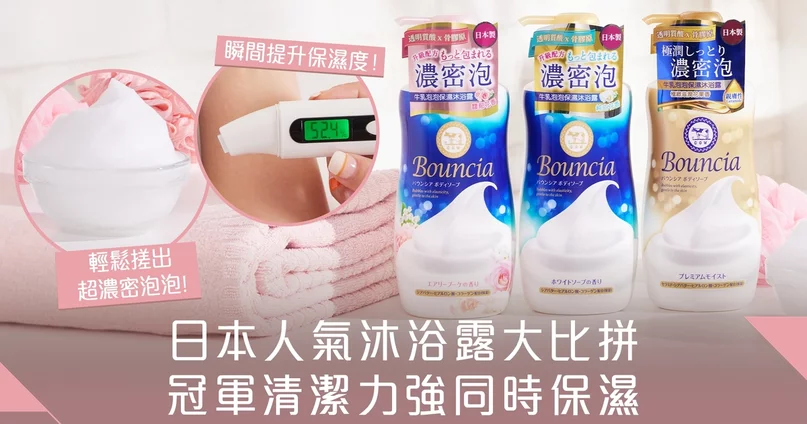 Bouncia牛乳泡泡保濕沐浴露是日本百年潔膚品牌Cow Style 牛乳石鹼旗下品牌。一泵份量即可搓出如忌廉般濃密有彈力的泡泡,革命性微泡技術打造出比毛孔更細的泡泡,減低摩擦肌膚,同時能深入毛孔洗走污垢,甚至空氣中PM2.5懸浮微粒亦能一併帶走。