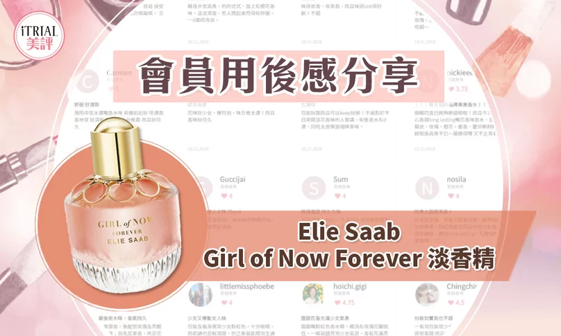 iTRIAL美評於2019年10月與Elie Saab合作舉辦了產品試用活動,積分80分或以上的會員有機會得到 Elie Saab Girl of Now Forever 淡香精 乙份 (名額:50名)。