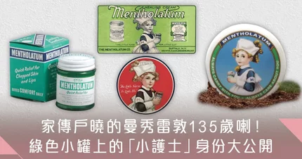又到夏季,一有蚊叮蟲咬,或者曬後令皮膚痕癢灼熱,必定會塗用家傳戶曉的「曼秀雷敦薄荷膏」,是許多家中藥箱、梳妝台的抽屜,甚至是女生手袋中出現的萬用好物。原來 MENTHOLATUM曼秀雷敦這個品牌不經不覺已經陪伴了我們135年,令人最有印象是包裝上Iconic的小護士圖像。大家對這個熟悉的居家護理綠色小罐的認識有多少?一起來看看!