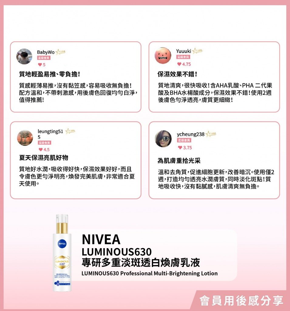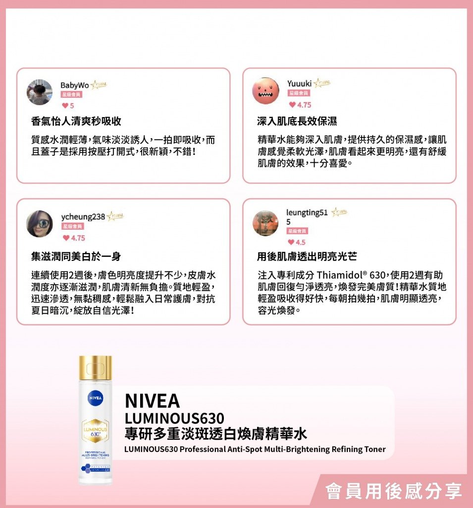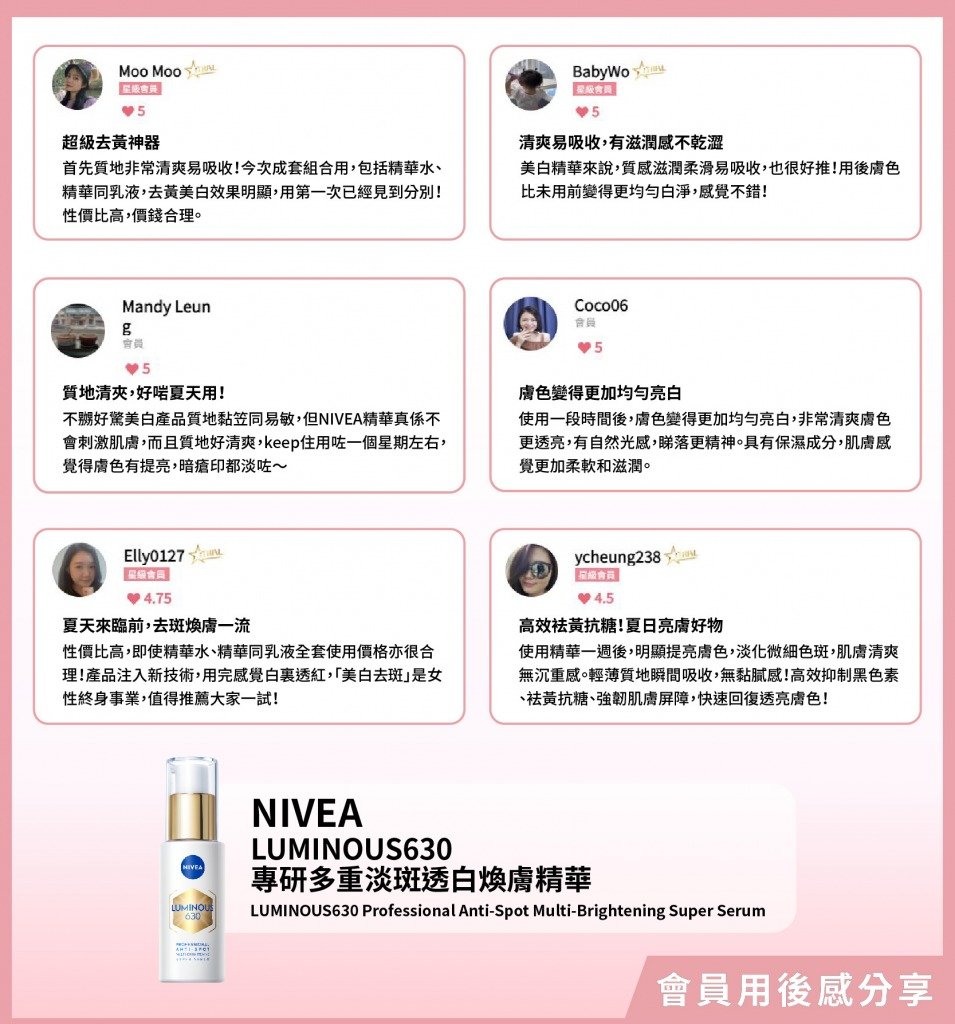 「作為一個忙碌嘅香港媽媽,NIVEA LUMINOUS630系列真係救咗我嘅暗黃肌膚!精華水清爽易吸收,精華淡斑袪黃超有效,乳液保濕不黏膩。用咗14天,暗瘡印淡化、膚色均勻,肌膚亮白好似打咗光咁,老公讚我白咗呀!超開心!全系列搭配使用效果更好,性價比高,強烈推薦給想快速變白嘅姐妹!」