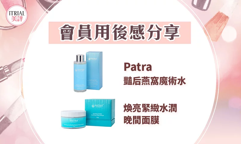 iTRIAL美評於2021年6月與 Patra 合作舉辦了產品試用活動,留言3個或以上的新會員有機會得到 Patra 豔后燕窩魔術水 及 煥亮緊緻水潤晚間面膜 (價值$836,名額30名) 乙份。現時試用活動已經結束,來看看部分會員的用後感心得吧!