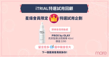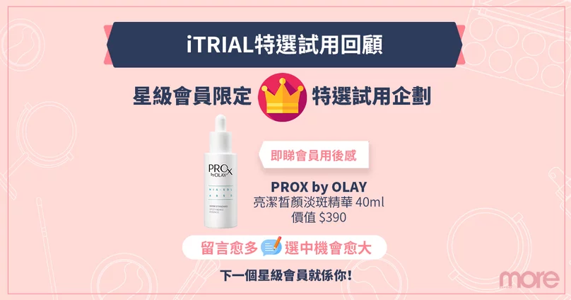 iTRIAL美評於2022年7月邀請了一眾星級會員一同試用 PROX by OLAY亮潔晳顏淡斑精華 (抗氧淡斑精華)。 現時特約試用活動已經結束,來看看部分會員的用後感心得吧!