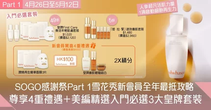 SOGO感謝祭又到,全城女生準備血拼!未溫習的護膚控,一定不可以錯過雪花秀全年最抵優惠!新會員購買套裝即享4重迎新優惠*: $100折扣、潤燥再生精華面膜3片、皇牌養肌體驗組合**及全單雙倍積分**(總值高達$655)***,超豐富禮遇!心動就要立即行動!